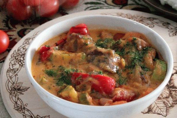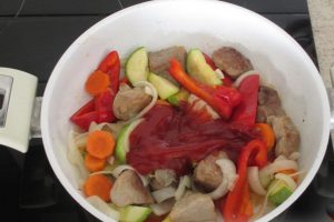 Пиперки, моркови и кромид, излупени и исечени доволно големи на парчиња. Фрли зеленчук на месо и, исто така, испржете ги кога зеленчук ќе биде скоро подготвена да ставите доматна паста, промешајте, намалете оган на минимум.