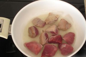 Исплакнете го свинското месо, тргнете го од вените и исечете средно коцка. Пржете го месото во голема количина масло.