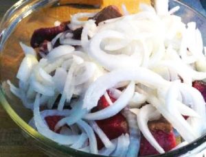 - Исечете го кромидот во прстени или половина прстени. Додадете на парчиња месо, сол и бибер. Измешајте, кашајте раце. Кромидот мора да пушти вашиот сок.