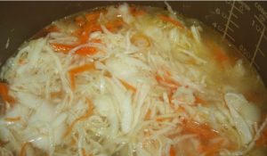 - За ова време, подгответе ја зелката. Ние поминуваме моркови со кромид натаму масло и додавајќи кора на нив, истурете 300 мл. вода. Зафатете го на тивок оган 60 минути додека не биде транспарентен. зелка.