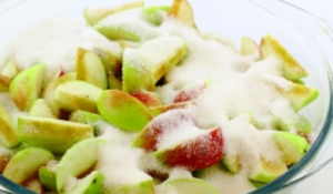 - Земете го садот во кој ќе го подготвите џемот. Посипете јаболка со шеќерни слоеви. Оставете ги 6 часа на јаболка пуштете го сокот.
