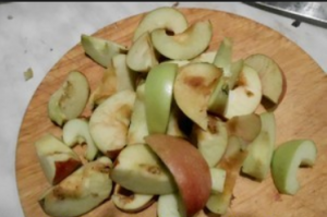 - Следно, исечете ги јаболките на парчиња, ставете ги во тава и пополнете со вода. Ставете ја тавата на бавен оган и варете јаболка 30 минути.
