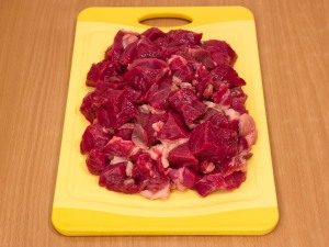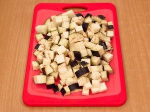 - Подгответе го зеленчукот. Исечете ја модар патлиџан во коцка. (Горчлив солена модар патлиџан, исплакнете во ладна вода по половина час). Лак кора и се сече на половина прстени. Домати, исто така, се сече на коцки.