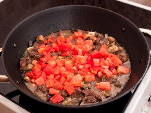 - Додадете домати, сол, бибер, измешајте и изматете Бавен оган прикриен половина час.