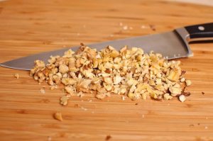 - Мелете ги оревите, испржете ги во сува тава 2 минути, мешајќи. Изладете и посипете салата на нив.