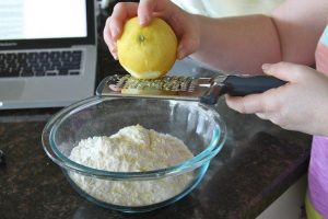 - Измешајте го целото брашно без 2 лажици со сода, сол и кора од лимон.
