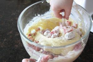 - Исечете јагоди и измешајте со преостанатото брашно, а потоа ставете ги најголемиот дел.