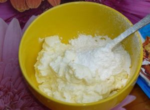 - Пред-разладен природен јогурт (јогуртот може да се замени со крем сирење или густа павлака) комбинирајте со ванилин шеќер и шеќер од шлаг, добро да се меша.