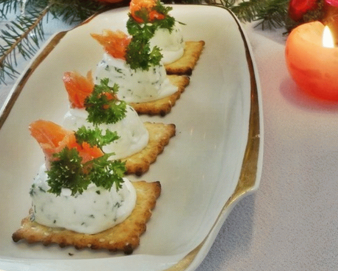 - Подмачкајте сè на врвот со крем и ставете розета од лосос.