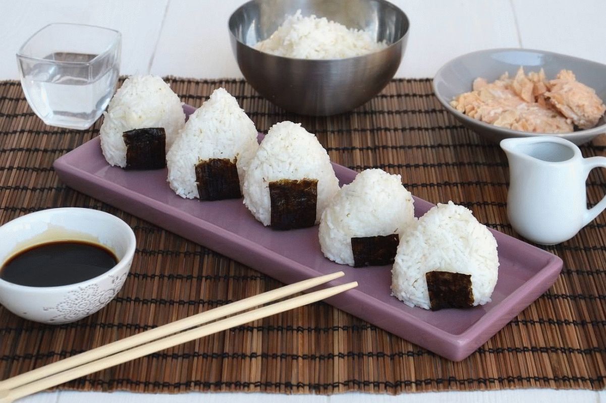 Онигири е традиционално јапонско јадење. Нему да готвите, треба да направите топчиња од ориз или триаголници со вкусни преливи на лосос.