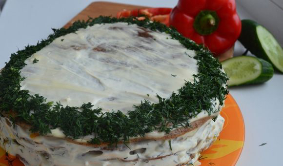 - Ставање на тортата заедно. Прв слој: ставете лажица и половина на палачинка сос од павлака-мајонез, рендан краставица на неа ренде, тогаш – моркови со кромид. Слоевите наизменично. Палто страни.