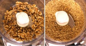 - Сортирајте ги оревите и исецкајте во комбинатот сè додека фините трошки, се меша со цимет. Поделете на 2 дела.
