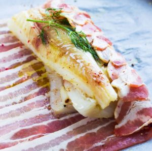 Прекрасно и неверојатно вкусно јадење од филе од треска, варен дома во рерната во парчиња сланина ќе ги воодушеви сите гостите вкус и оригиналност.
