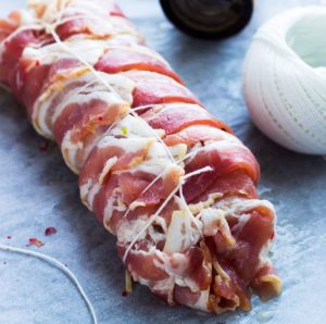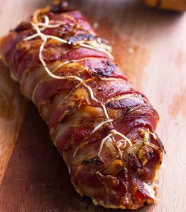 Ние извадиме мирисна треска во сланината, ја сечеме на парчиња, ставете го на чинија, тргнете го канап и сервирајте веднаш табелата.