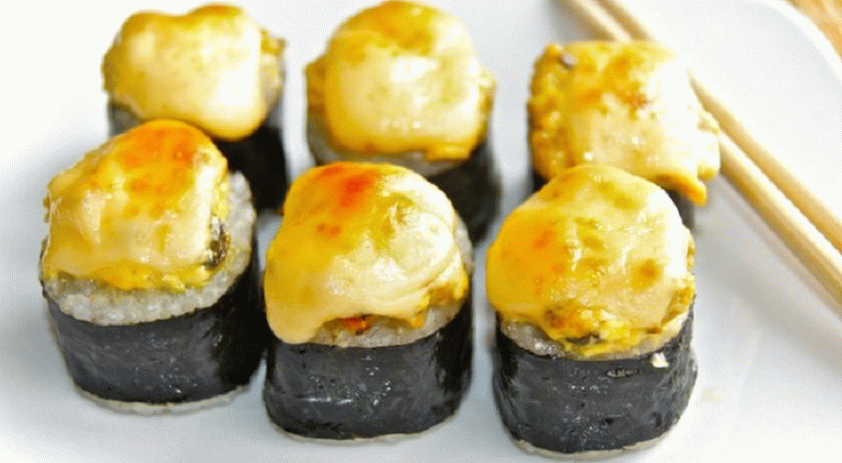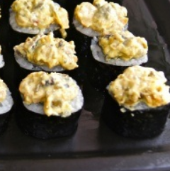 - На секоја ролна, внимателно поставете ги топиците со миди.