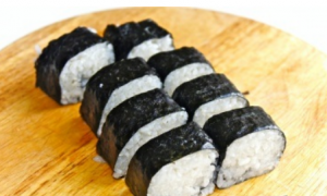 - Завиткајте ролна мавта над неа ставете лист нори (со груба страна нагоре) и слој ориз, оставајќи лента на крајниот раб празна.