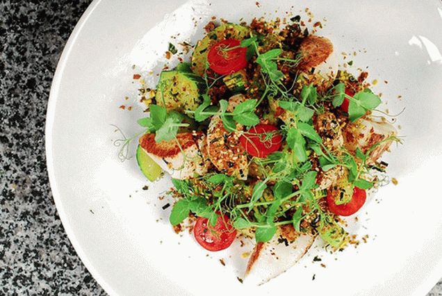 - Загрејте го аспарагусот со тиквички во маслиново масло, не пржете, но само загревајте. Ставете зеленчук на чинија, на врвот ширете лушпи и домати. Посипете со сок од лимон посипете со зачини и гарнирајте со зеле од грашок.