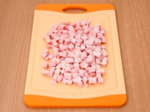 - Шунка (или која било друга посно колбас, како што е balyk, шунка, исецка) со остар нож, исечете уредно коцки.