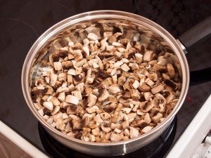 - Излупете, измијте, исечете ги печурките на мали парчиња.