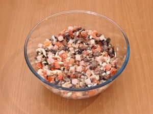 - Во волуменски сад, комбинирајте ги разладените печурки, шунка, цреша, јајца, лесно сол и бибер, измешајте.