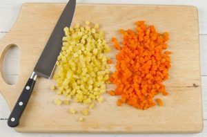- Гответе ги компирите и морковите додека не се тендер, излупете и изладите. Исечете ги на мали коцки.