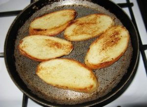 Пржете ги парчињата леб во тава од двете страни.