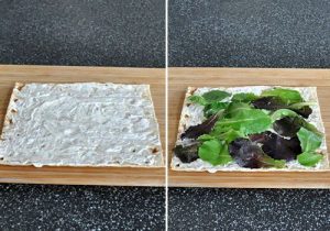 - Ширење пита леб со мајонез, посипете со италијански Леќата. Од горе ставете лисја од зелена салата.