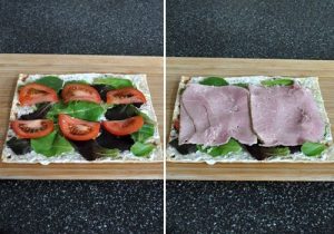 - Исечете го доматот и изгаснете го. Исечете ја шунка на парчиња и да изложам.