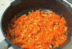 - Во меѓувреме, ги пренесуваме морковите и кромидот во масло со доматна паста. Фрли passerovka во супа.