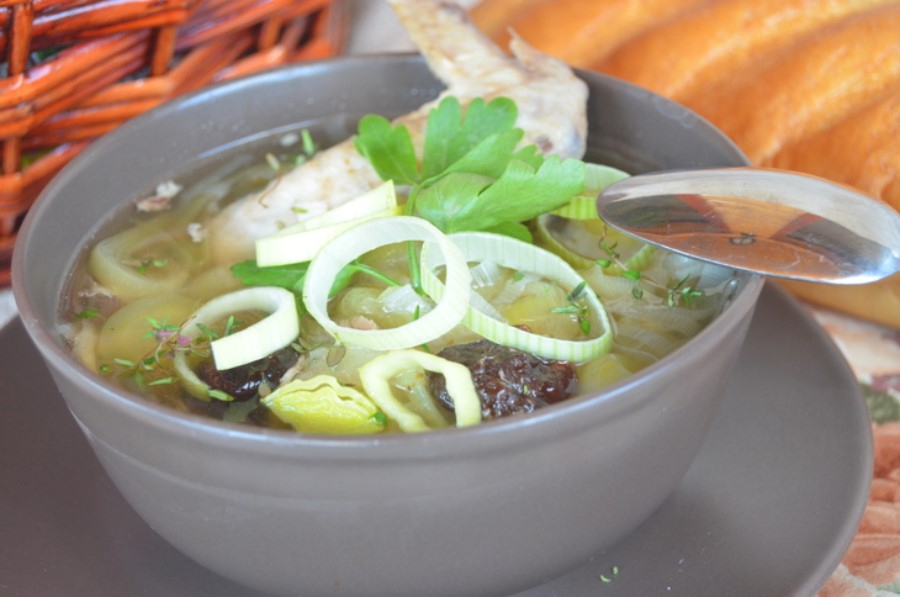 Светски познат супа од коки-лики направена со пилешко праз, што значи негов превод имиња. За да го готвите дома, исто така ќе ви треба сливи и каранфилче, а други честопати се користат во готвењето дома зачини