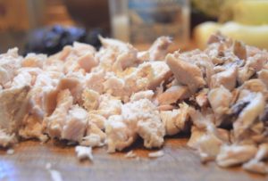 - Расклопувајте варено пилешко од коските, исечете го месото.