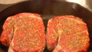 - Ние ги миеме стеклото од телешко месо, ги бришеме суво, премачкајте го месото маслиново масло од сите страни, истријте ги стеките со зачини и посипете ги со сол, оставете на собна температура 40 минути.